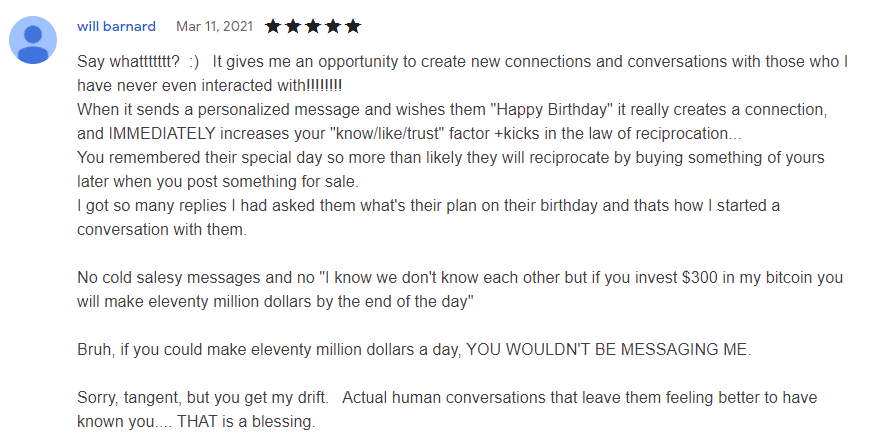 "Easy to use! As marketers, we need to stay top-of-mind with our prospects, leads, and customers. This is the perfect way to do that. Everyone appreciates when we remember their birthday, and we can remind them of what we do and maybe even give them something special to them, we stick on their mind for when they need our product or service down that road. This is a brilliant extension!"